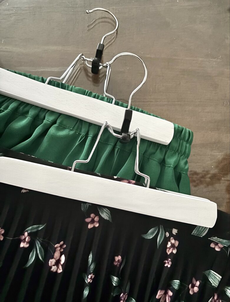 - Pliseeröcke am besten hängend lagern. Hierfür eignen sich Hosenbügel* bestens.